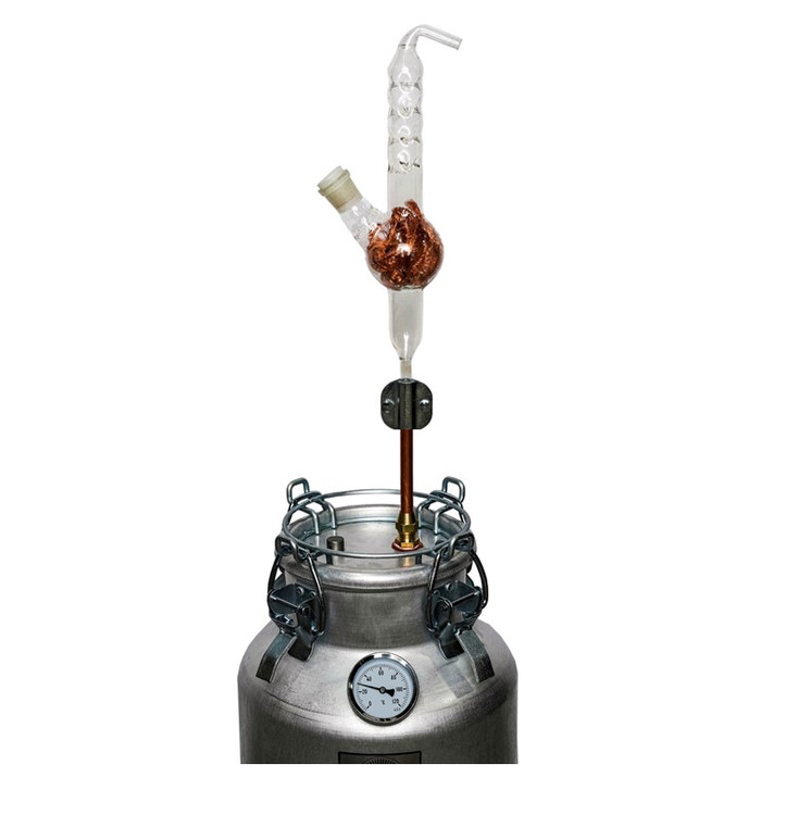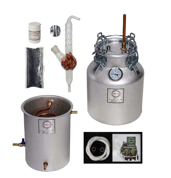 دستگاه تقطیر 16 لیتری با خنک کننده سطلی آبی بهمراه دماسنج - سوپاپ اطمینان - ذغال اکتیو و سدیم سولفات که مناسب استفاده در منزل می باشد قابل استفاده بر روی گاز کابینتی بوده و براحتی می توانید در منزل عرق گیری انجام دهید. البته این پکیج از دستگاه تقطیر که بهمراه خنک کننده سطلی آبی می باشد را می توانید بروی گاز کابینتی بگذارید ولی اگر از دیگ عرق گیر 16 لیتری بهمراه کندانسور برقی استفاده می کنید ، نمی توانید بر روی گاز کابینتی گذاشت چرا که دستگاه تقطیر 16 لیتری بهمراه کندانسور برقی قدرت گاز بالایی میخواهد و شما حتما بایستی جهت آن دستگاه تقطیر از گاز تک شعله جداگانه استفاده نمائید. دستگاه تقطیر 16 لیتری با خنک کننده سطلی آبی از آب جهت تبدیل بخار به مایع استفاده می کند و در این نوع از خنک کننده ها از یک سمت آب وارد شده و از سمت دیگر آن ، آب گرم حاصل از تقطیر خارج خواهد شد. دقت کنید فقط دو سوم از دیگ تقطیر را پر نمائید طوریکه حتماً یک سوم آن خالی باشد تا فشار به دستگاه تقطیر نیاید.