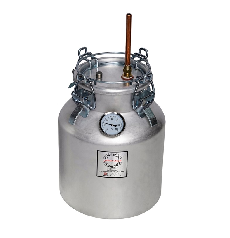 دستگاه تقطیر 16 لیتری با خنک کننده سطلی آبی بهمراه دماسنج - سوپاپ اطمینان - ذغال اکتیو و سدیم سولفات که مناسب استفاده در منزل می باشد قابل استفاده بر روی گاز کابینتی بوده و براحتی می توانید در منزل عرق گیری انجام دهید. البته این پکیج از دستگاه تقطیر که بهمراه خنک کننده سطلی آبی می باشد را می توانید بروی گاز کابینتی بگذارید ولی اگر از دیگ عرق گیر 16 لیتری بهمراه کندانسور برقی استفاده می کنید ، نمی توانید بر روی گاز کابینتی گذاشت چرا که دستگاه تقطیر 16 لیتری بهمراه کندانسور برقی قدرت گاز بالایی میخواهد و شما حتما بایستی جهت آن دستگاه تقطیر از گاز تک شعله جداگانه استفاده نمائید. دستگاه تقطیر 16 لیتری با خنک کننده سطلی آبی از آب جهت تبدیل بخار به مایع استفاده می کند و در این نوع از خنک کننده ها از یک سمت آب وارد شده و از سمت دیگر آن ، آب گرم حاصل از تقطیر خارج خواهد شد. دقت کنید فقط دو سوم از دیگ تقطیر را پر نمائید طوریکه حتماً یک سوم آن خالی باشد تا فشار به دستگاه تقطیر نیاید.